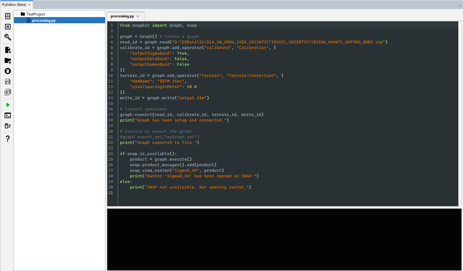 PyEditor brings a first-class Python experience directly into SNAP (BETA) - You can prototype, run, and ship EO processing workflows without leaving the SNAP ecosystem. Under the hood it embeds a modern Python runtime and exposes a pythonic wrapper of the SNAP Java API called